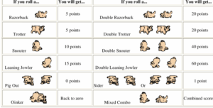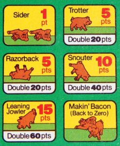 The way you score points is based on how the pigs land (shown below). If the pigs land in a “compromising position” (“making bacon”) then you lose all points from every round, restarting you at 0.